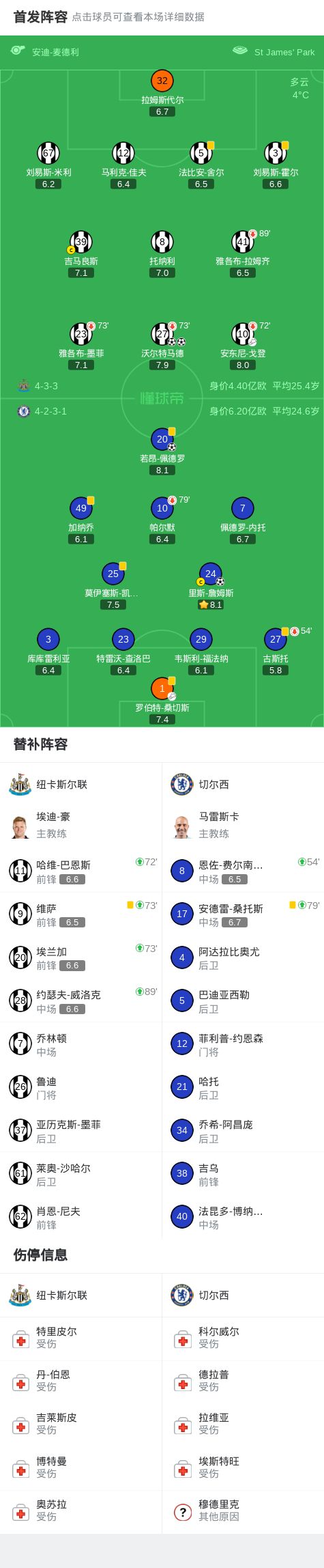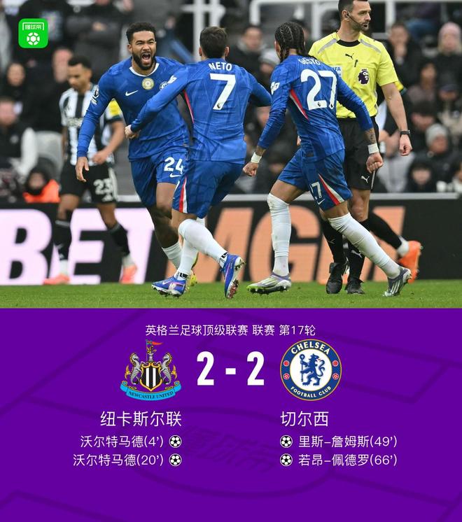 北京时间12月20日英超联赛第17轮,纽卡斯尔联主场对阵切尔西。沃尔特马德上半场梅开二度。里斯-詹姆斯任意球世界波,若昂-佩德罗利用个人能力扳平比分。最终切尔西客场2-2纽卡。